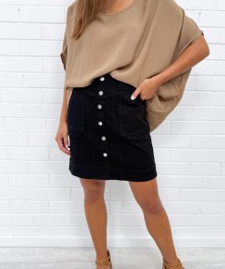 A classic A-line denim skirt with some gorgeous detailing on it – we looove it. The pockets are good, the buttons are good, the detail and angle of the embroidery on the hips is perfection, and the length is good. It also has belt loops just in case you want to add a belt 😊