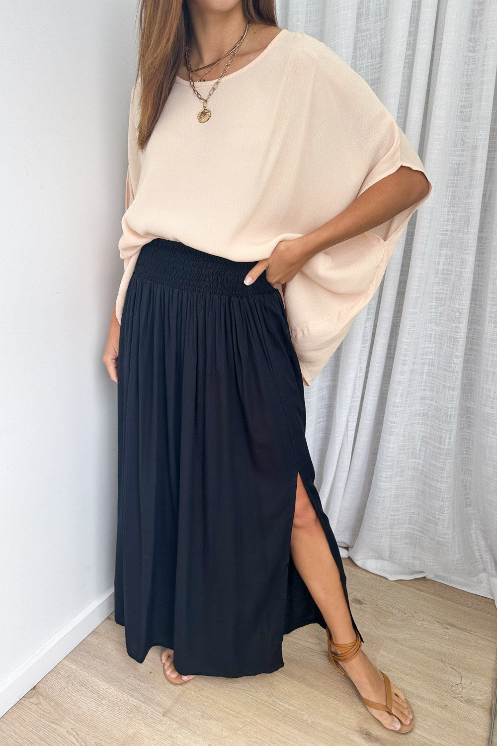 Comfy and just so easy, there’s nothing not to love about it. Nice maxi length, the waist has a thick elastic band which can sit down low or up higher, and it feels nice on.