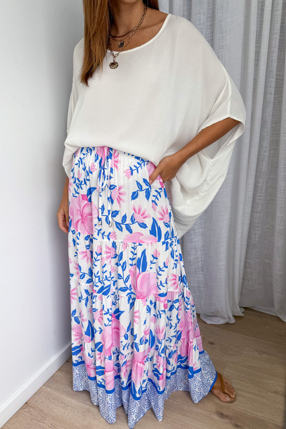 We love maxi skirts, and this one is pretty. The tier down the bottom floats behind you as you walk so naturally, you feel like a princess when wearing it. And the waist is elastic.