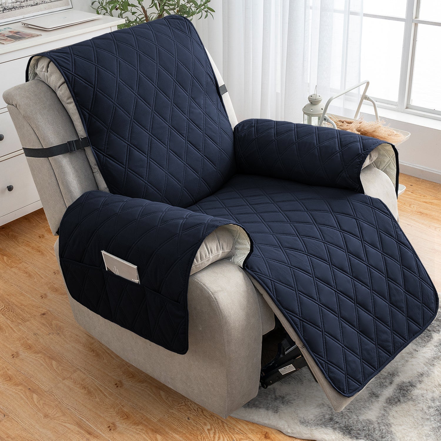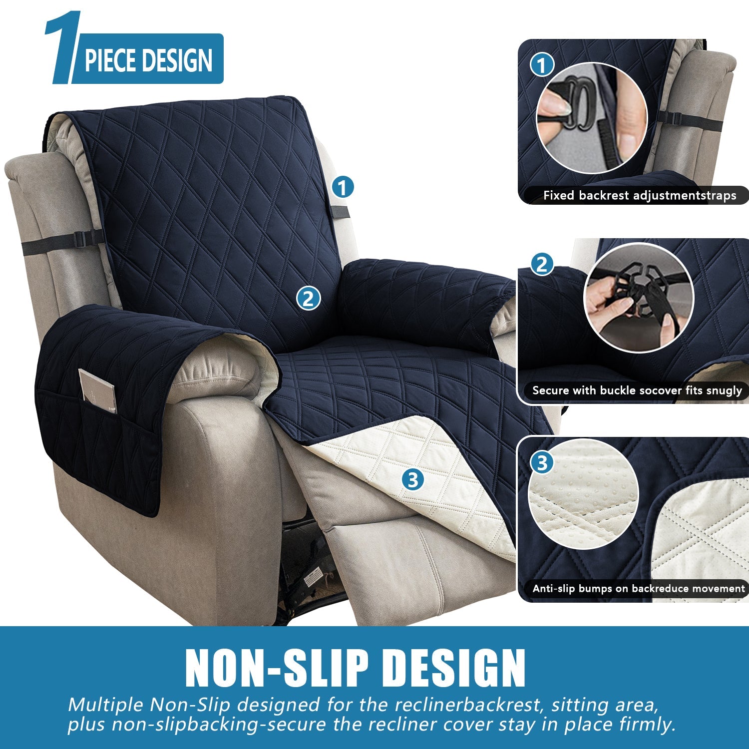 🌷【REDUCE SLIP-OFF CONCEPT】Reduce movement around! 1. Solid round colloid design on the back of our recliner cover; 2. Additional flexible elastic straps; 3. Two elastic bands at seat’s back side and the matching buckle, to reduce the sliding of the recliner chair slipcover, even on the leather furnitures.