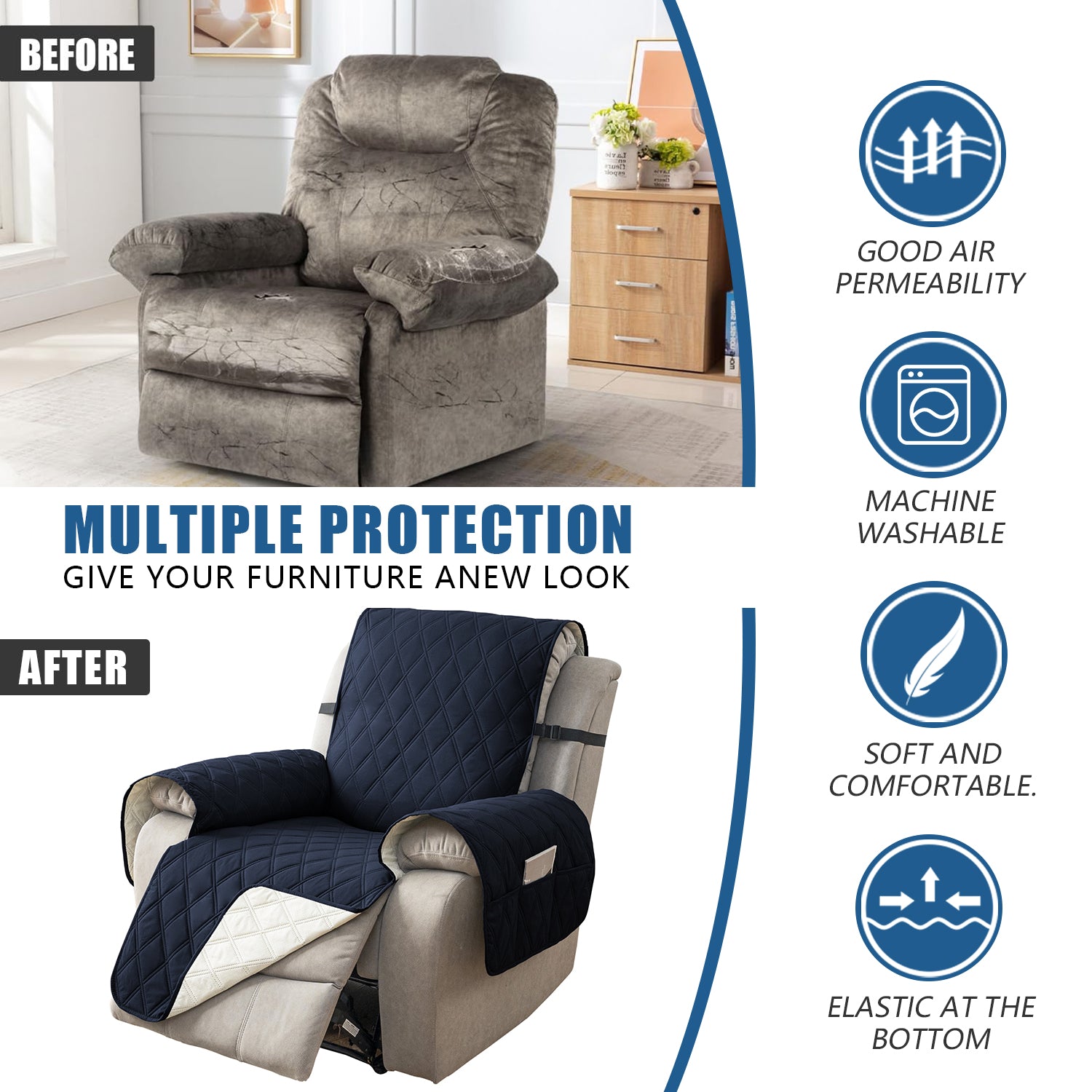 🌷【HIGH QUALITY MATERIAL】Sureix reclining chair cover are made of choiceness material, quilted from 5 layers of durable fabric, and the inner-layer is filled with soft texture fabric to make it more comfortable, soft, durable and strong, it would be a great choice for homes with kids and pets.