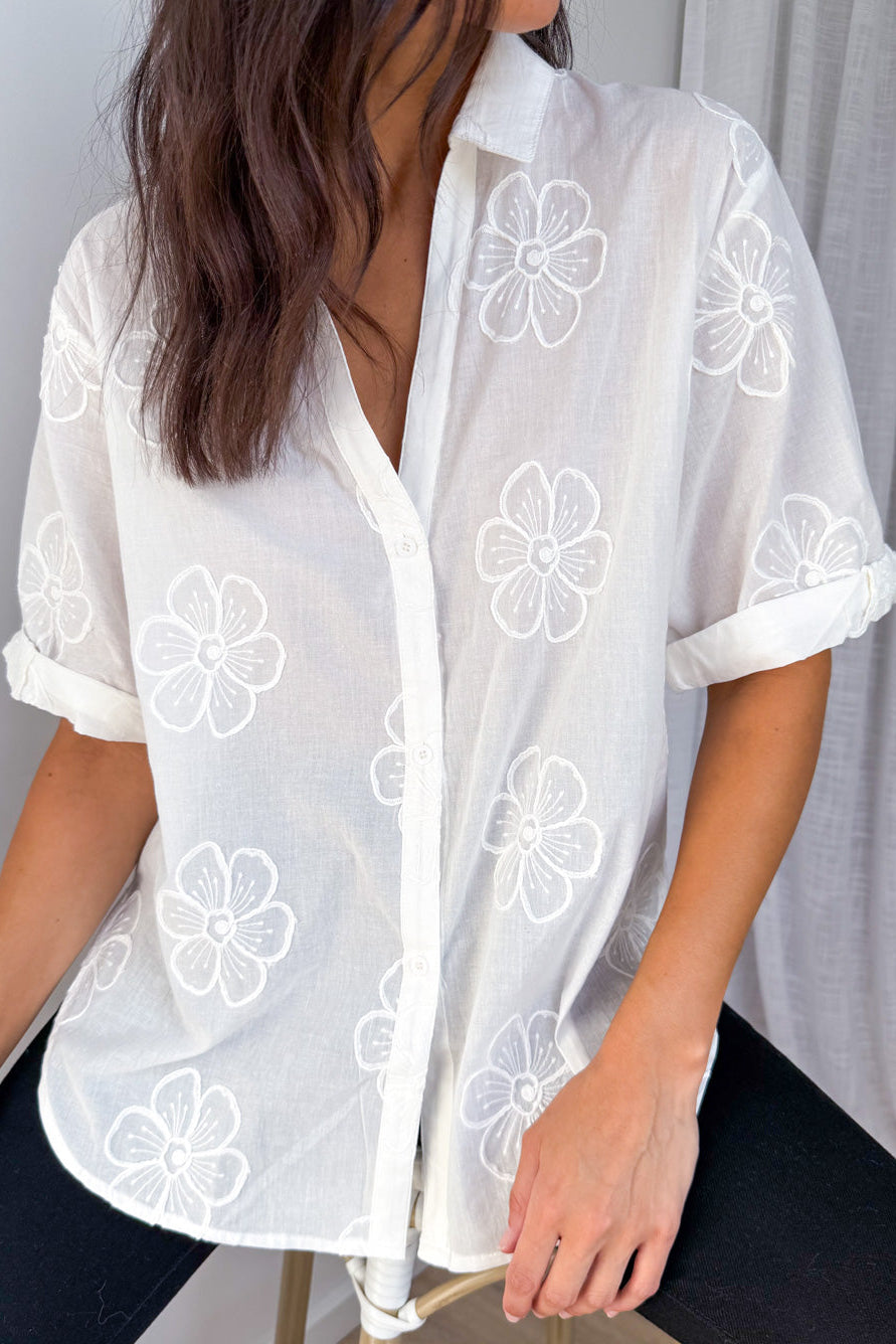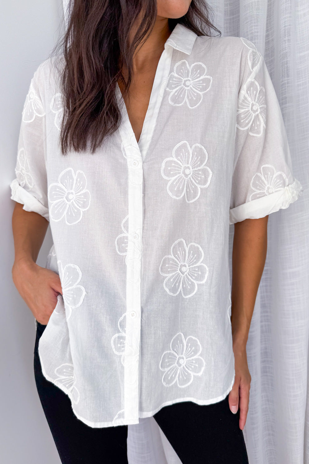 Easy to wear and effortless to style, we love the shape. Tuck it in or wear it loose, whatever suits your mood. The beautiful floral detailing makes a statement, while the collar adds a refined, polished touch.