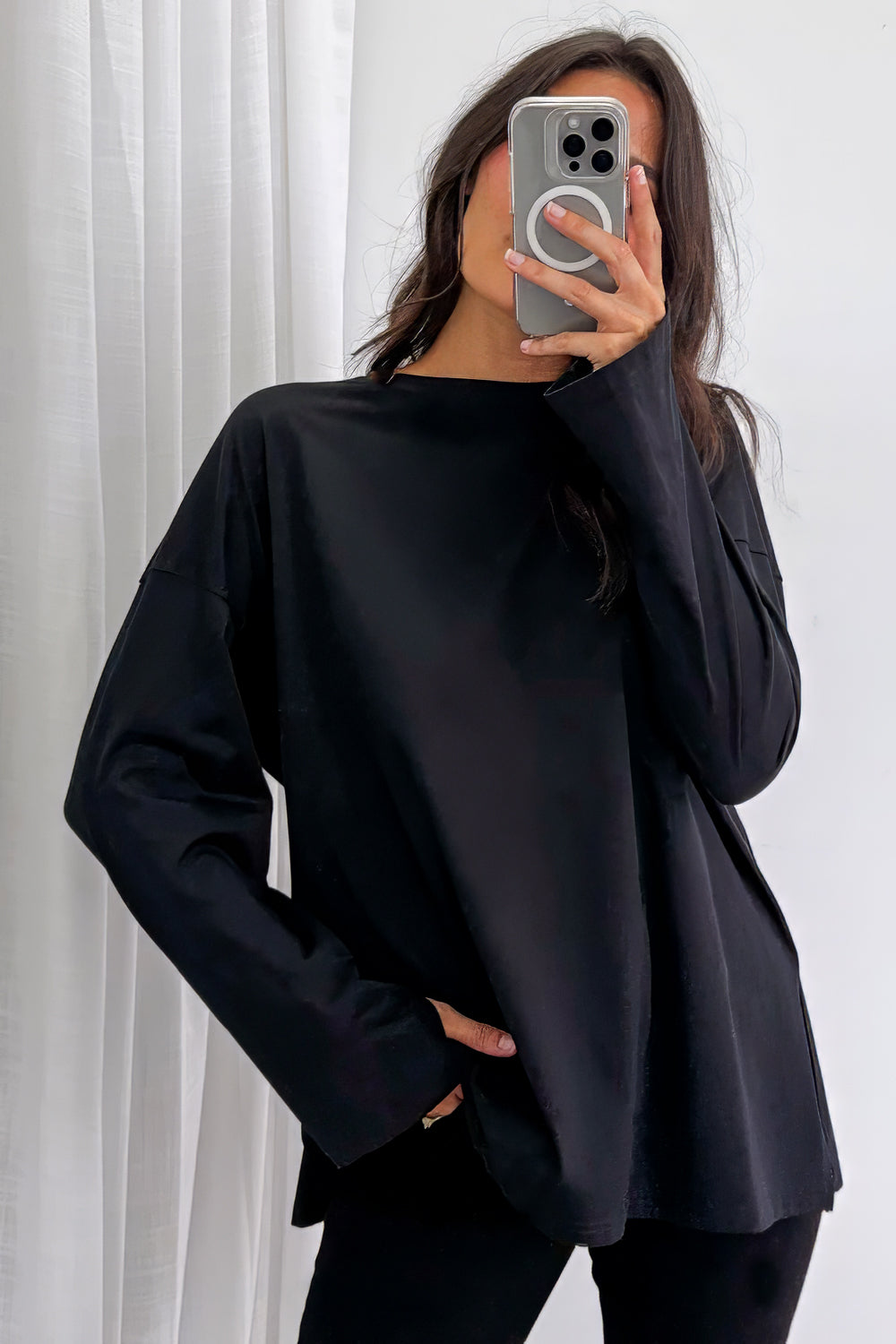 An easy basic this long sleeve is one you’ll reach for again and again. A boxy shape which is flattering, a good length, and the thumb holes add a nice detail. It layers beautifully or works perfectly on its own, easy, practical, and so good to wear.