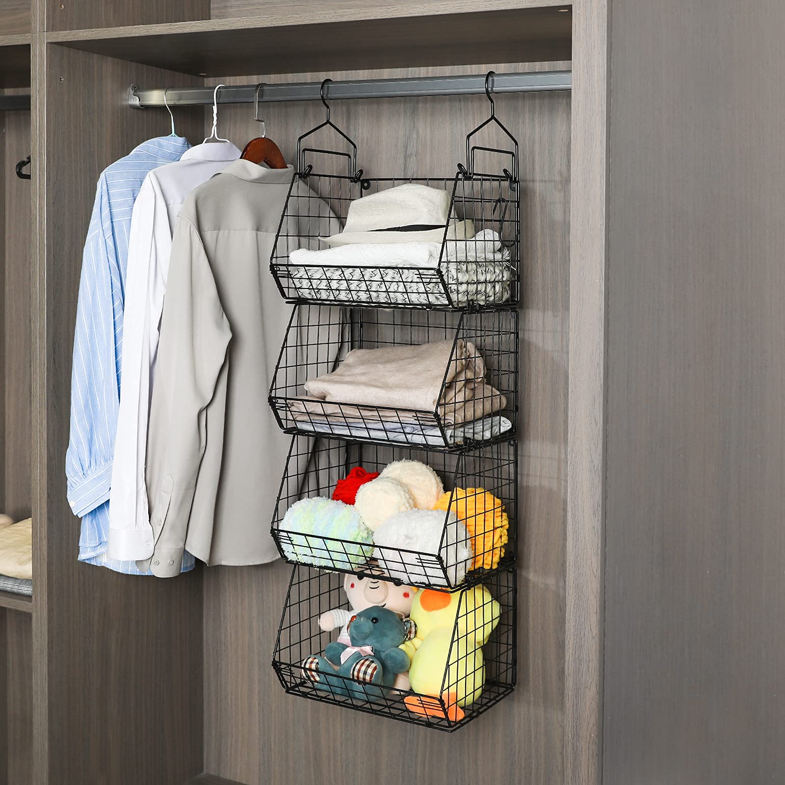 Closet hanging organizer is the layered design, used alone or stacked according to your own need and idea. And you can screw all the three baskets together and hang them as a unit on the closet rod to store clothes, hats, sweaters, jeans, shirts, shoes, purses and other accessories. Also, you can hang 2 baskets on the wall, and place 1 on the shelf. You can DIY the using methods.
