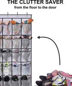 55.6″(L) x 22″(W). Our over the door organizer is made of thick fabric, which is strong durable and not easy to be torn. 24 mesh pockets promote airflow and keep your shoes clean and shape. This Door shoe rack can easily hold at least 12 pairs of men’s size 13 shoes – up to 40 pounds of weight. (a pair of toddler shoes can fit into 1 pocket).