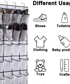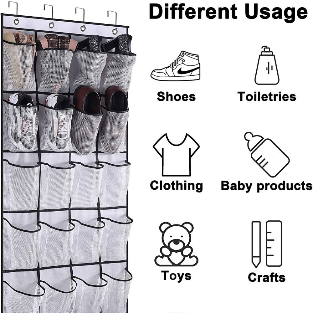 The shoe organizer over the door updates 4 sturdy hooks that fit closer for most doors and closets, helping to prevent the hanging shoe rack from sagging in the middle. So you can place it on the closet door, bedroom door, bathroom door, storeroom door and more wherever you want. These 4 reinforced hooks are strong and durable enough to hold up to 40 pounds.