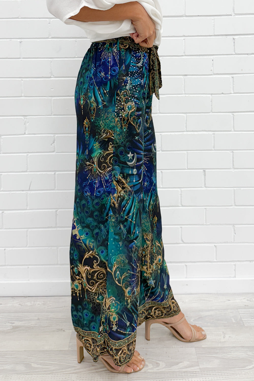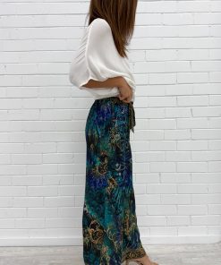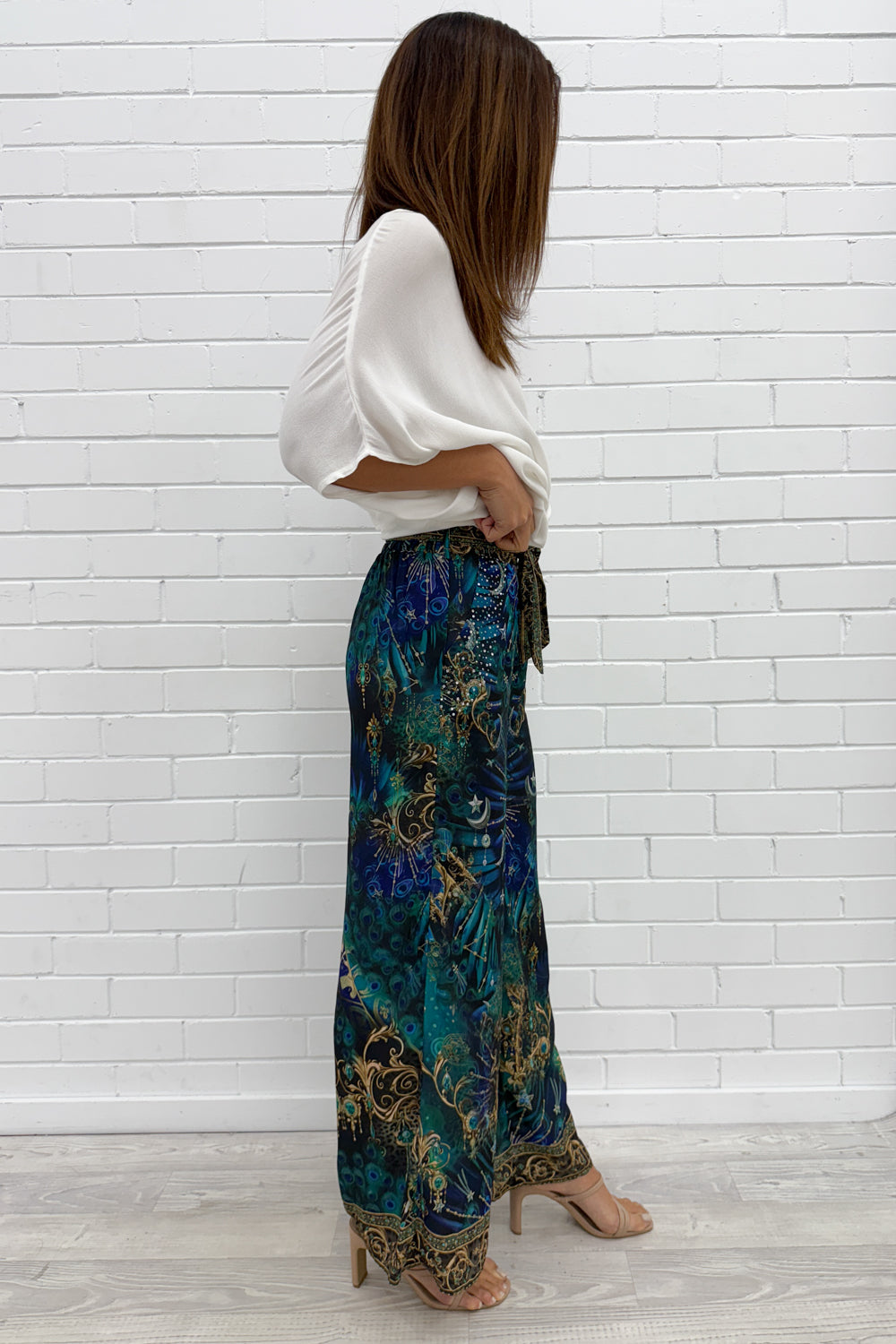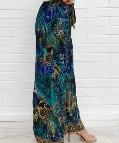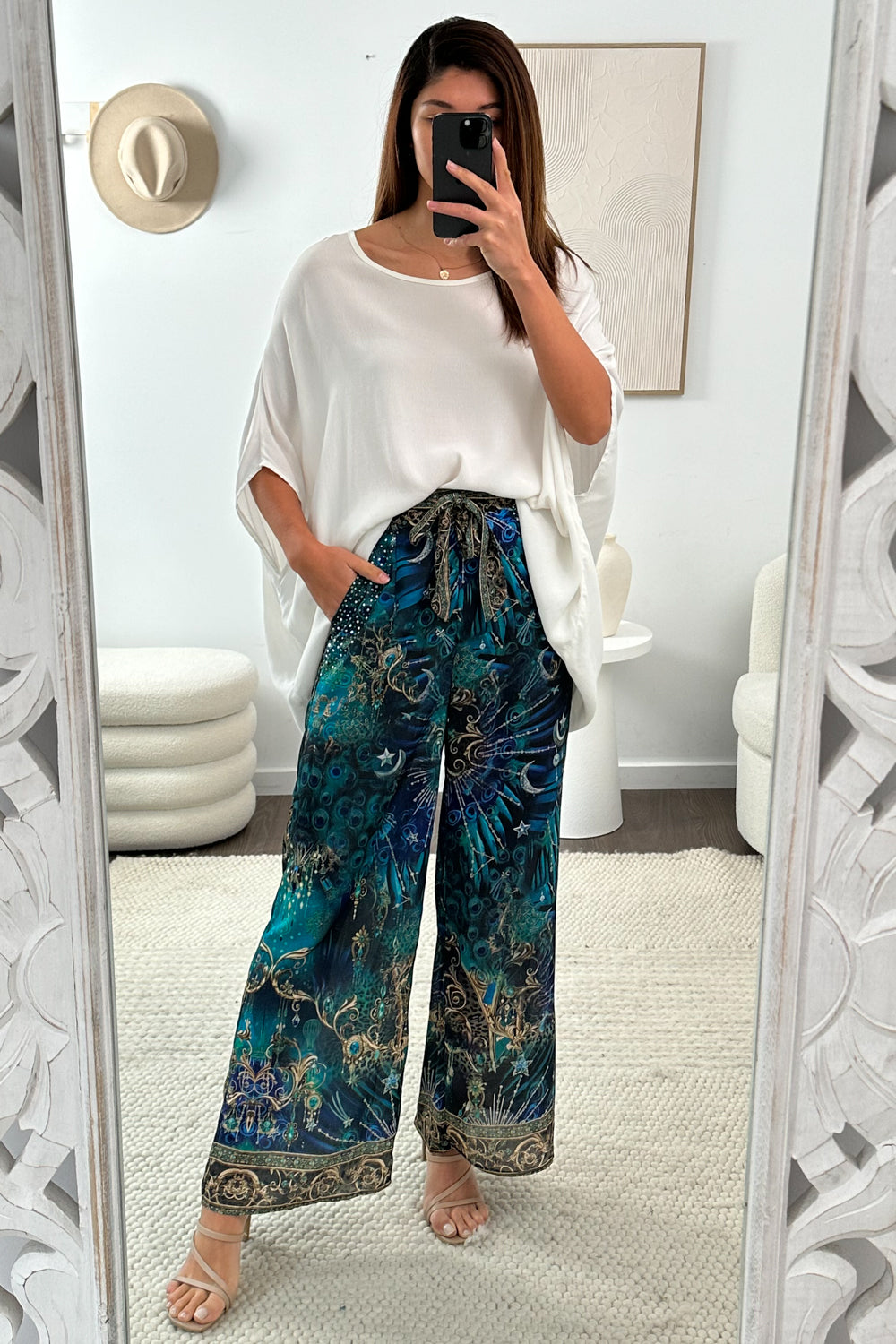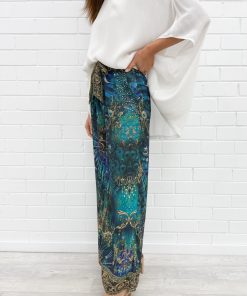 Beautiful print and colours. The waistband is elasticated, and there is a removable belt. The wide-leg shape drapes beautifully down the leg, and the material is flowy. There’s a matching shirt, so you can wear it as a set!