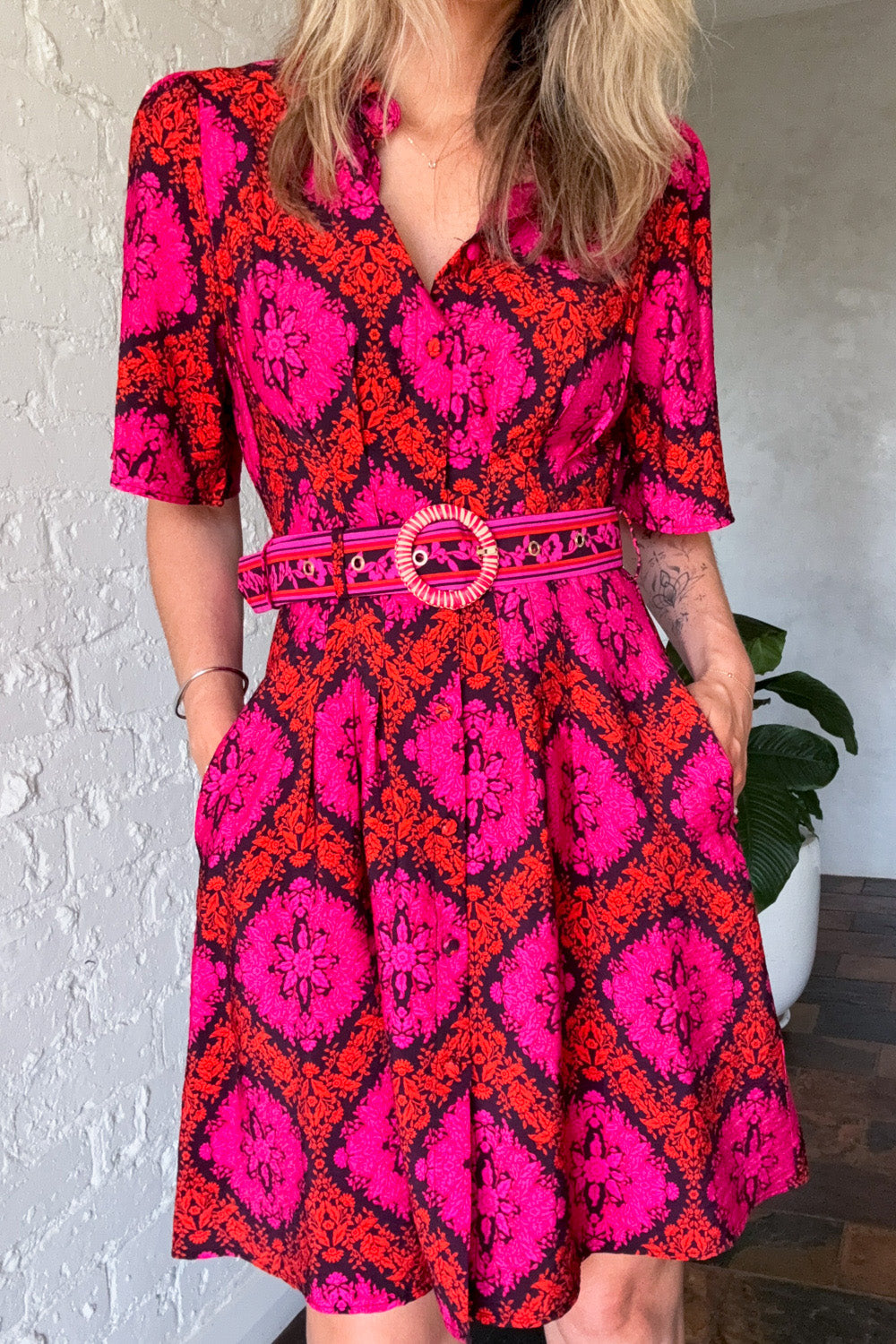 An above the knee dress which flatters and falls beautifully. Featuring a V-neckline with a collar and functional buttons, it balances polished details with effortless wear. A lovely sleeve and pockets add practical touches, while the removable belt lets you style it your way— belted, with your own, or simply on its own. Perfect for everything from casual days to dressed-up nights.