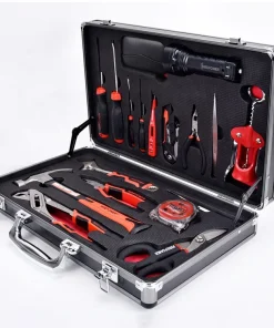 tool includes:Screwdriver, Nail scissors set, flashlight, 2m tape, Digital display tester pen, 115mm Long Nose Pliers, Multi-function electrical knife, bottle opener, 200mm Multi-function adjustable wrench, claw hammer, 250mm water pump, 175mm wire cutter, flat chisel, Tinner snips