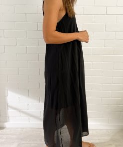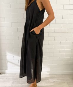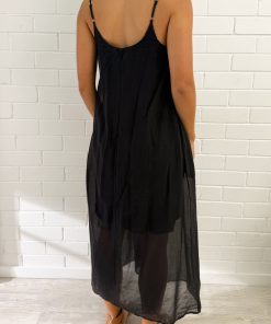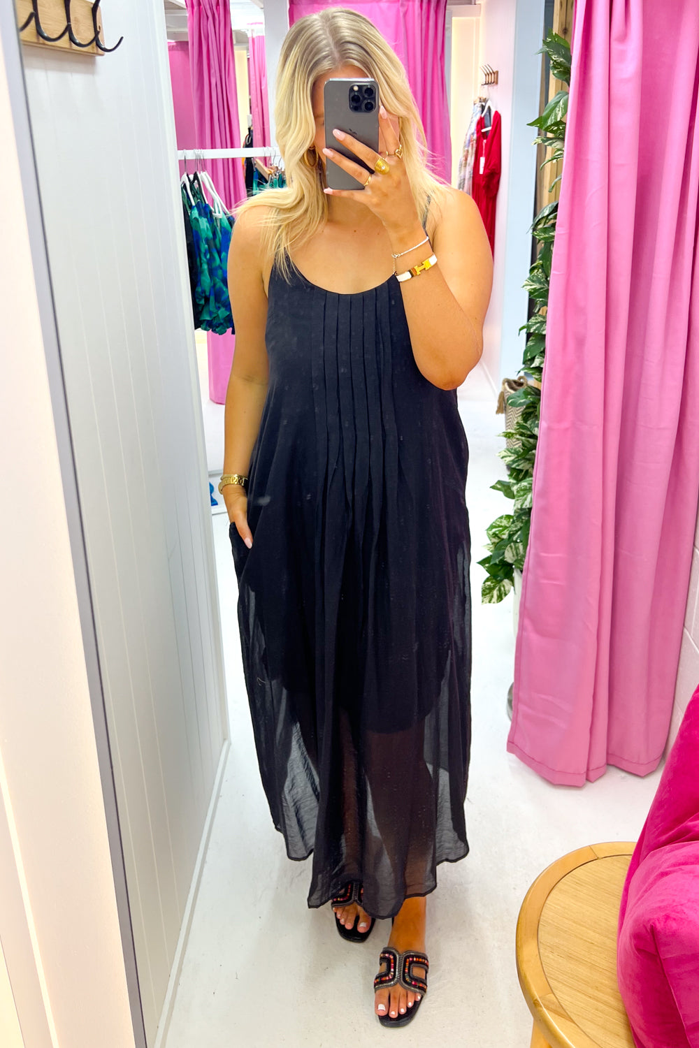 A simple, easy to throw on black midi dress. The fabric is nice, the straps are adjustable, the fit is good, and the pleats give it a little bit of a sophisticated look. Love.
