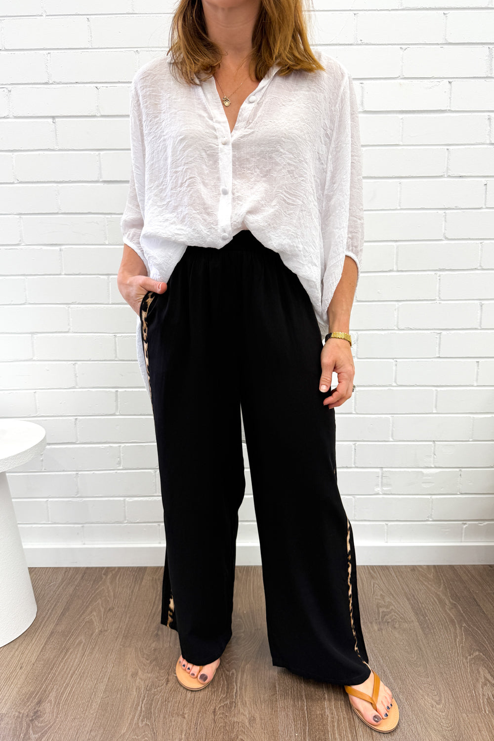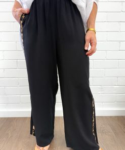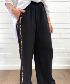 The petite version of Page Pants. A simple loose black pair of pants with an elastic waist, with a statement stripe down the side. A lovely fabric, they’re simple yet a kind of statement piece. They fall nicely, and can be worn dressed up with heels or thrown on with sneakers.