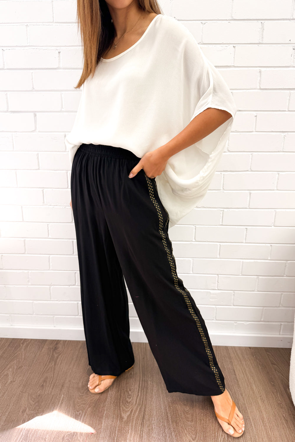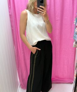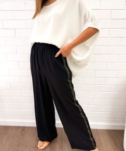 LOVE THESE! A simple loose pair of pants with an elastic waist, with a super cool stripe down the side. A lovely fabric, they’re simple yet a kind of statement piece. They fall nicely, and can be worn dressed up with heels or thrown on with sneakers.