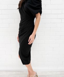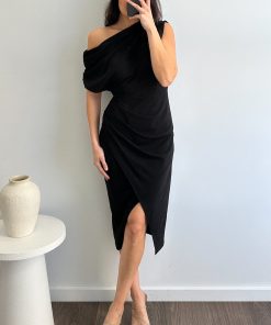 A great midi dress – a timeless style for every occasion. It has an understated one-shoulder shape, and the fabric drapes from the waist with a slight split to the knee. It’s a little bit stretchy too.