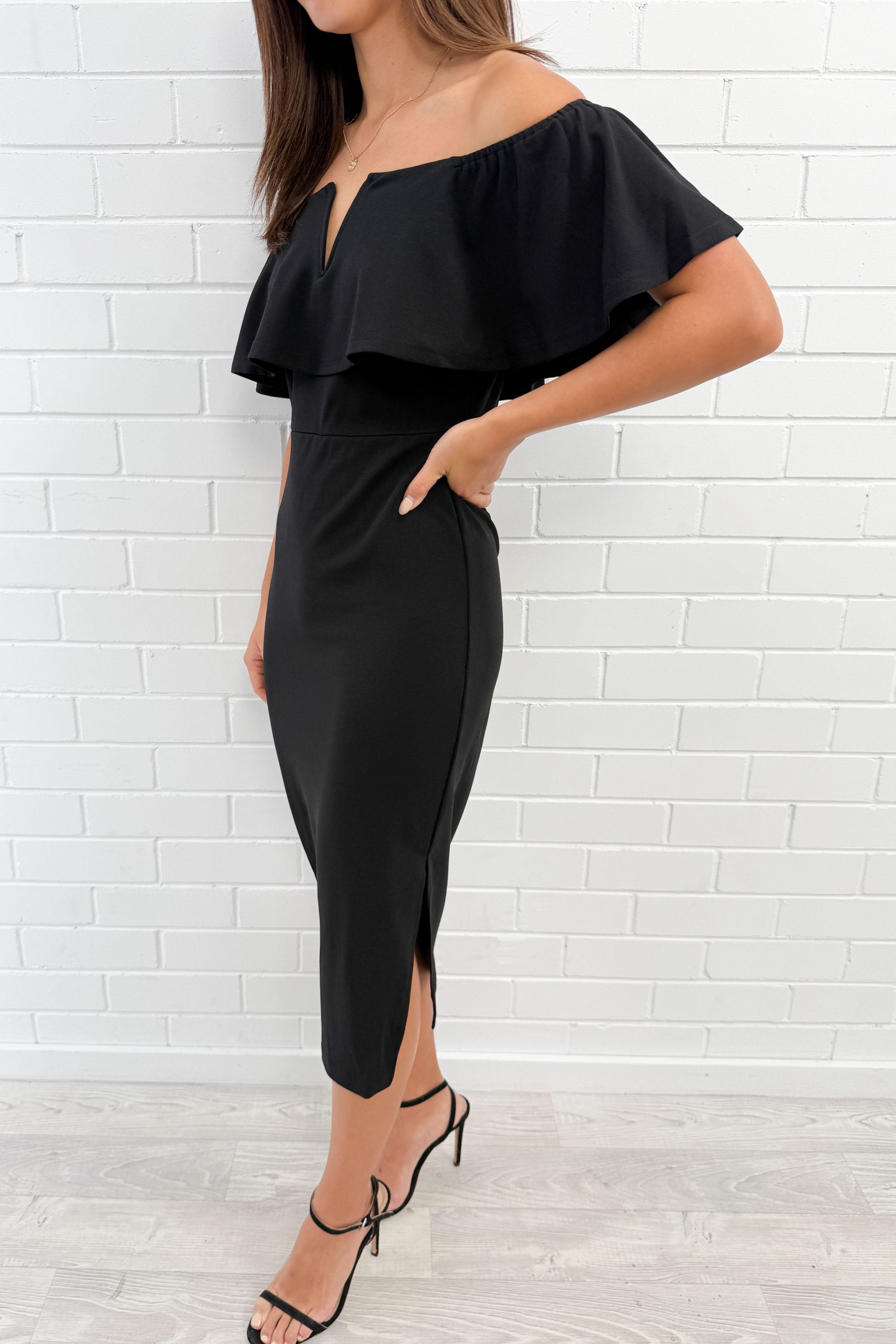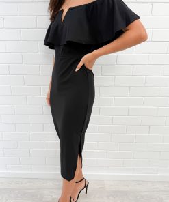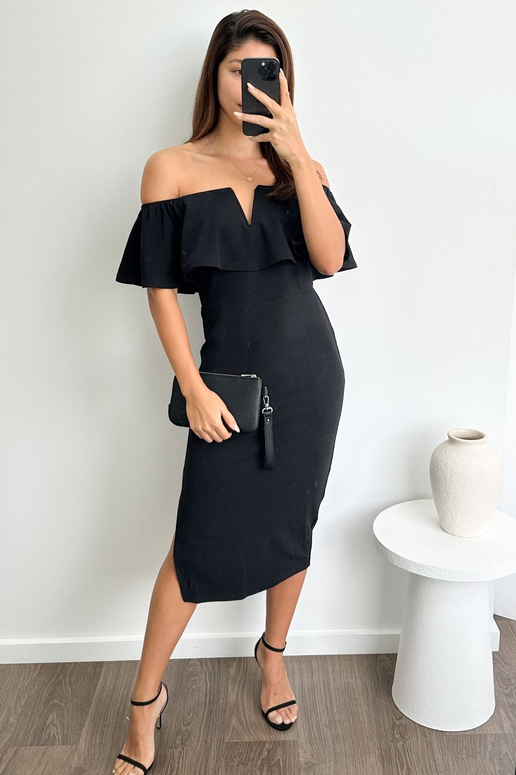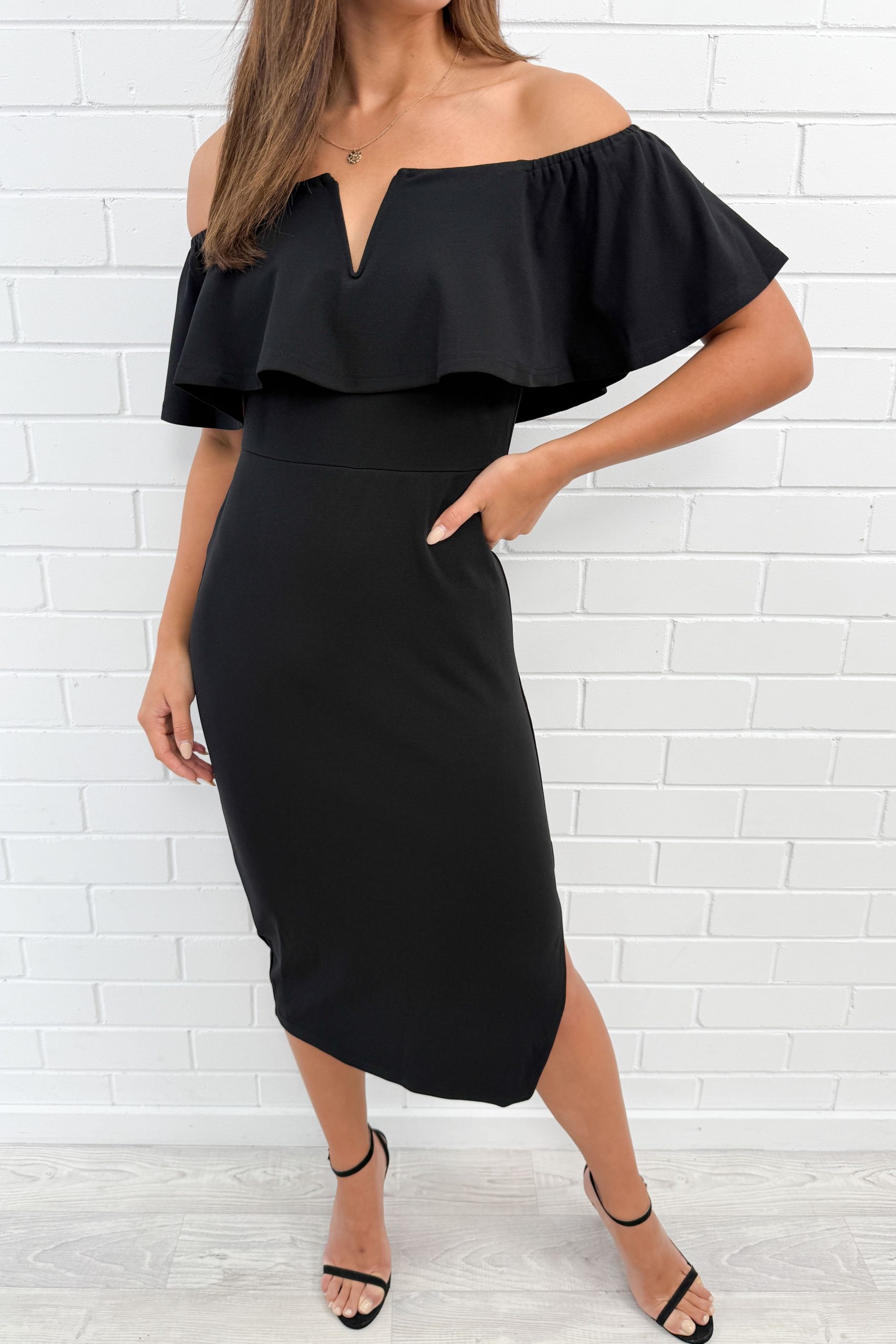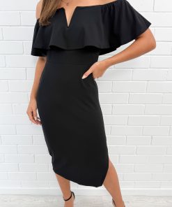 A great midi dress! It has an off the shoulder shape with a structured V and frill on the bust. The fabric drapes nice along the body with a slight split to the knee. It’s a little bit stretchy too.