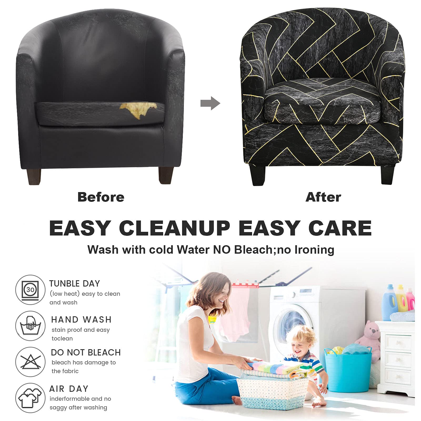 Machine washable in cold water. Low-temperature ironing, do not bleach. It’s easy to install the cover to the chair due to the high elasticity. Also very easy to remove it from the armchair, easy for daily replacement.