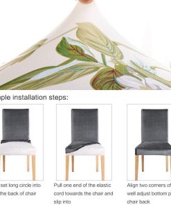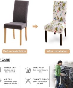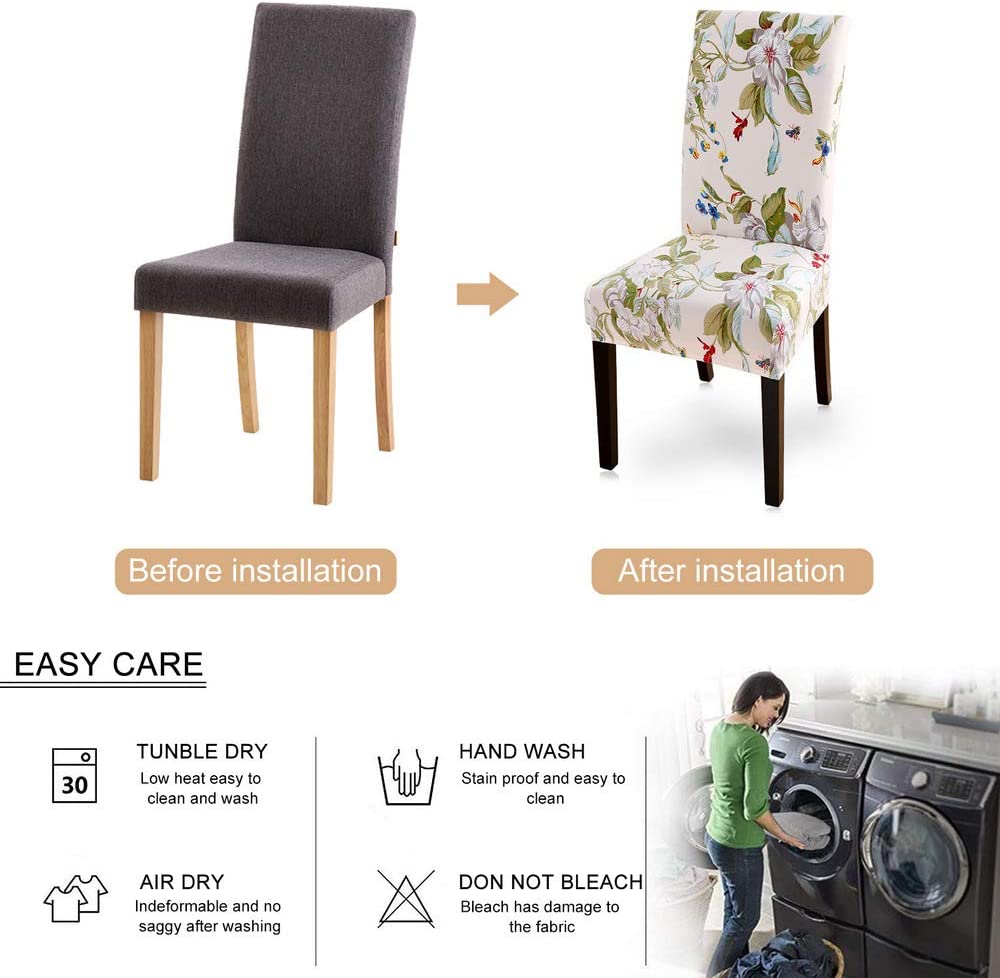 95% Polyester and 5% Spandex.Lalluxy Dining Chair Slipcovers are made from high quality material, which is super soft and comfortable. Plus the material is very stretchy, that’s why it would fit most of the dining chairs securely. The installation is also very simple with sewn-in elastic hem. It is washable and wrinkle resistant, no ironing is needed after wash.
