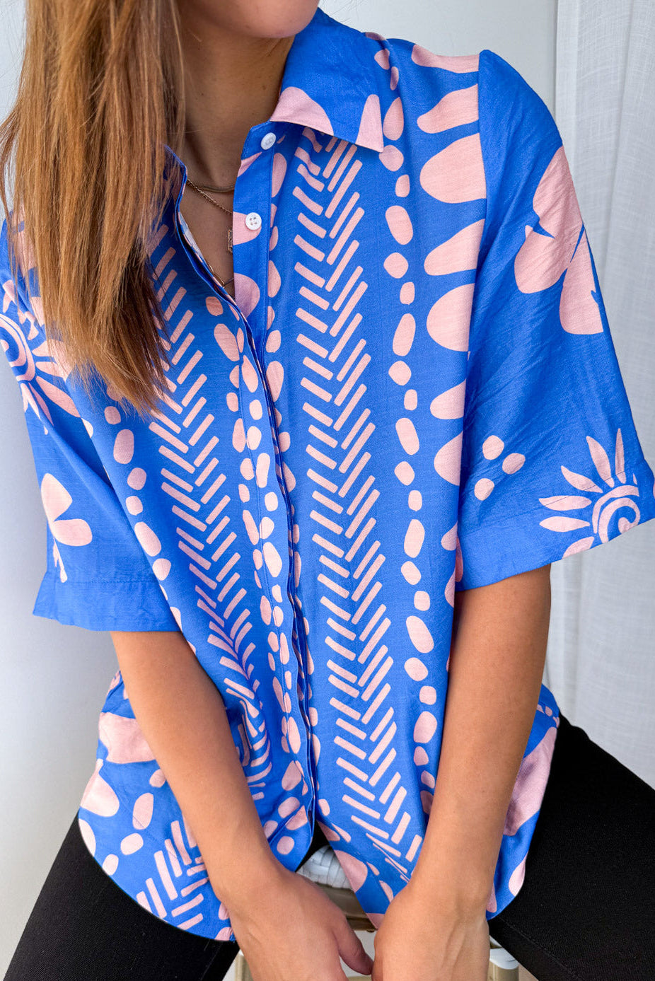 Oversized and fricking BEAUTIFUL, the shape of this is amazing, the sleeves are amazing, and the buttons are really nice. And the PRINT ❤️