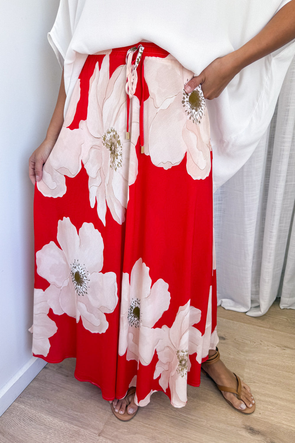 Just a really good basic skirt. A lovely shape, we love the pockets, and the adjustable elastic waist. And the print is epic.