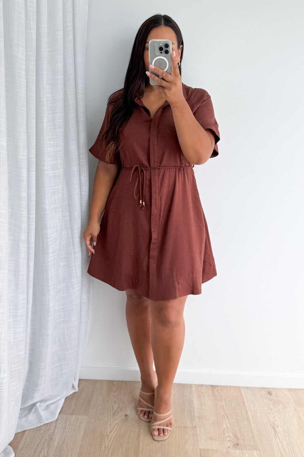 Just a good, basic shirt dress. Functional buttons all the way down the front which are covered, and it has pockets. The removable belt is a lovely feature too.